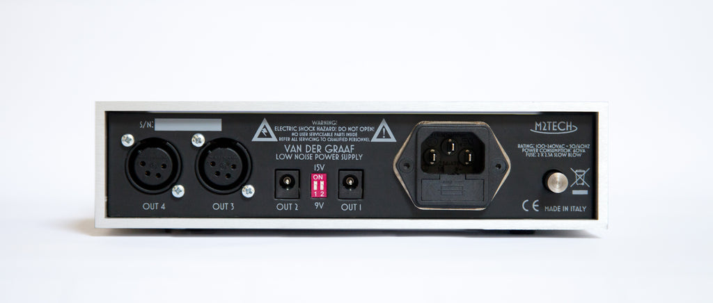 Van der Graaf is a very high performance, very low noise power supply suitable to power all M2Tech products. Thanks to its comprehensive outputs set and the settable output voltage for some outputs, user can power every M2Tech product, from 9V Evo units to 15V products like Young MK4/3, Young DSD, Joplin ADC, to the high-power Marley. Its very low output noise (comparable to that of a Li-Ion battery), even at rated load, allows for incredibly silent sonic background and finest detail resolution, markedly improving every powered product's performance. Fault-proof robustness is achieved by solid-state, automatically resettable fuses (polyswitch). In order to optimize the powering sequence of the units connected to the Van der Graaf, the user can program the activation sequence of the used outputs.